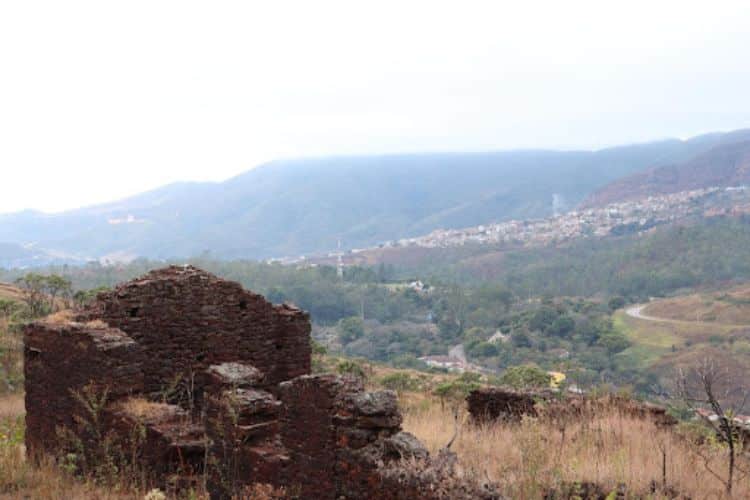Após alguns minutos de caminhada já foi possível avistar as ruínas da antiga vila que existia no morro, onde as pedras que sustentavam as casas ainda se encontram empilhadas, sendo identificáveis os locais onde ficavam as portas e janelas. Mesmo com a beleza e história do local, as antigas construções se encontram completamente abandonadas. Já houve projetos para transformar o lugar em parque municipal. Porém, como a terra é propriedade da Mina de Passagem, um processo judicial seria muito complexo e demorado.