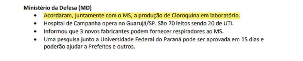 Depois dessas várias manifestações em favor da cloroquina, a partir de julho de 2020 o representante da Defesa não volta mais ao assunto, ou pelo menos suas palavras sobre cloroquina não aparecem mais nas atas do CCOP.