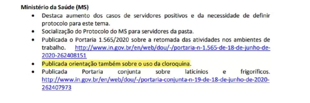 Dois dias depois, em 19 de junho de 2020, o Ministério da Saúde anunciou ao CCOP que publicara uma “orientação também sobre o uso da cloroquina”.