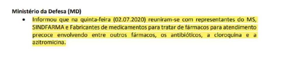 As atas do CCOP demonstram que a palavra dos cientistas nada importava para os militares da Defesa. Em 3 de julho de 2020, o representante da Defesa informou que no dia anterior havia se reunido com “representante do MS [Saúde], Sindfarma e fabricantes de medicamentos para tratar de fármacos para atendimento precoce envolvendo entre outros fármacos, os antibióticos, a cloroquina e a azitromicina”. Há no país alguns sindicatos de empresários da indústria farmacêutica chamados de “Sindifarma” ou “Sindfarma” – a ata não deixa claro a qual organização se referia.