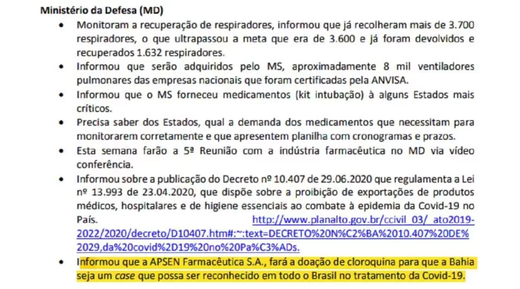 Defesa apoiava indústria que pretendia tornar a Bahia um “case” no uso da cloroquina