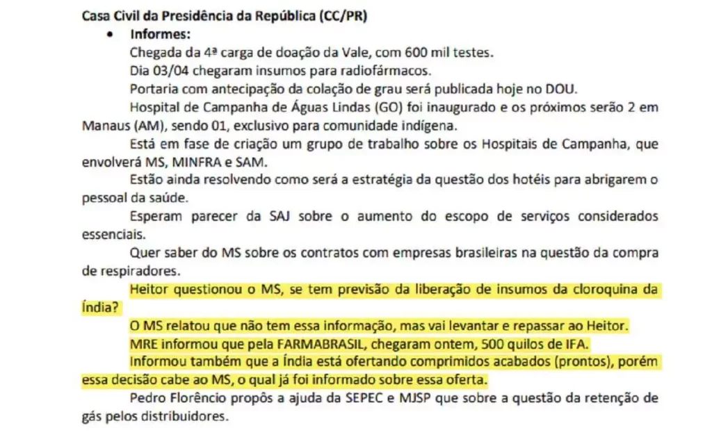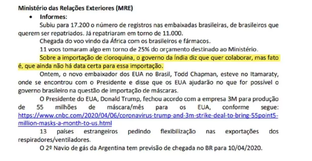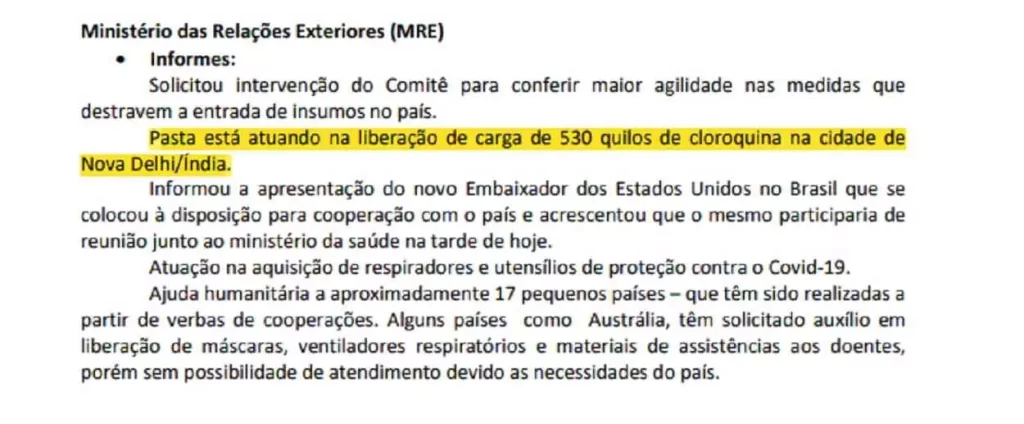 Em 2 de abril, o representante do MRE informou que o ministério “está atuando na liberação de carga de 530 quilos de cloroquina na cidade de Nova Délhi/Índia”. No dia seguinte, o MRE reiterou ao CCOP: “Sobre a importação de cloroquina, o governo da Índia diz que quer colaborar, mas fato é, que ainda não tem data certa para essa importação”.