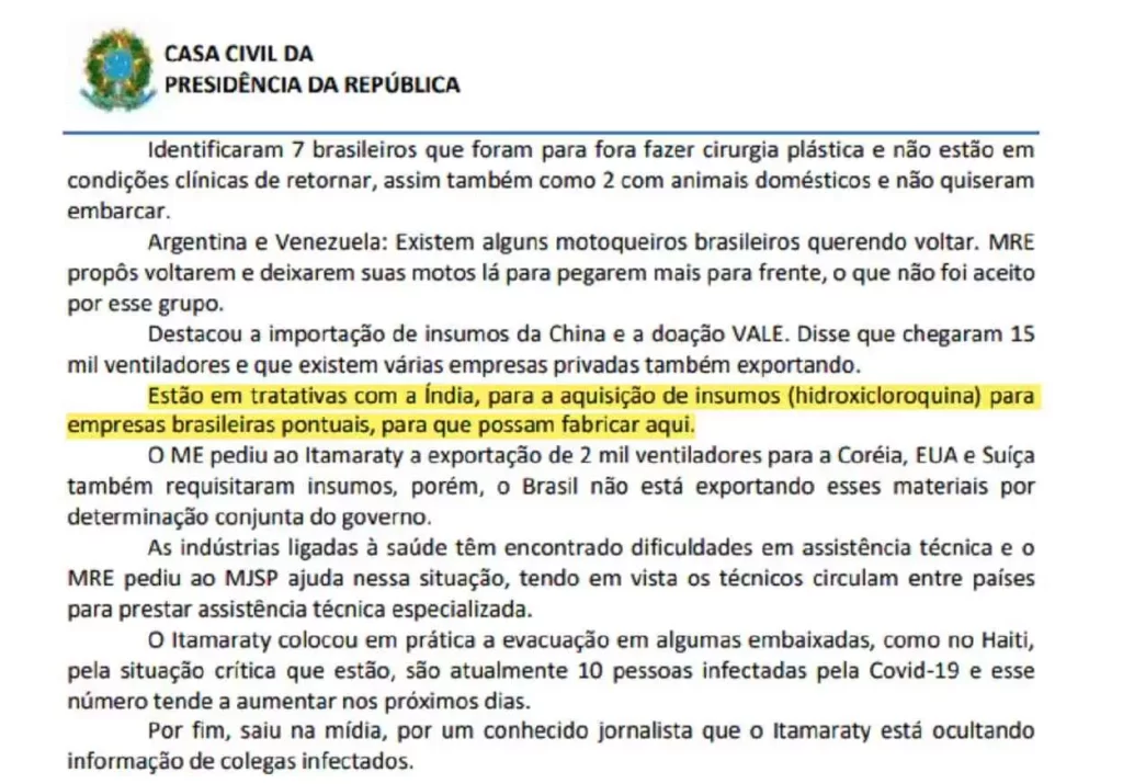 O MRE estava empenhado desde o começo da pandemia na obtenção de produtos da Índia no tema da cloroquina. Em 1º de abril, o representante do MRE informou ao CCOP que “estão em tratativas com a Índia, para a aquisição de insumos (hidroxicloroquina) para empresas brasileiras pontuais, para que possam fabricar aqui”. Uma das que reclamava da “retenção” de produtos da Índia era a Farmabrasil, associação que reúne as principais empresas da indústria farmacêutica brasileira.