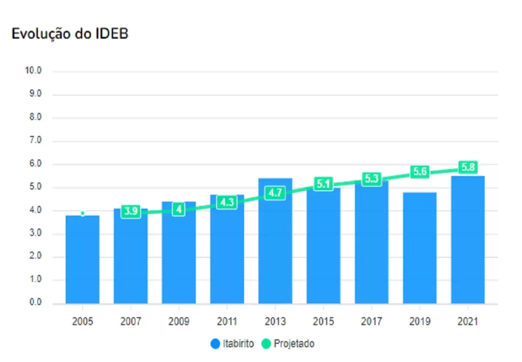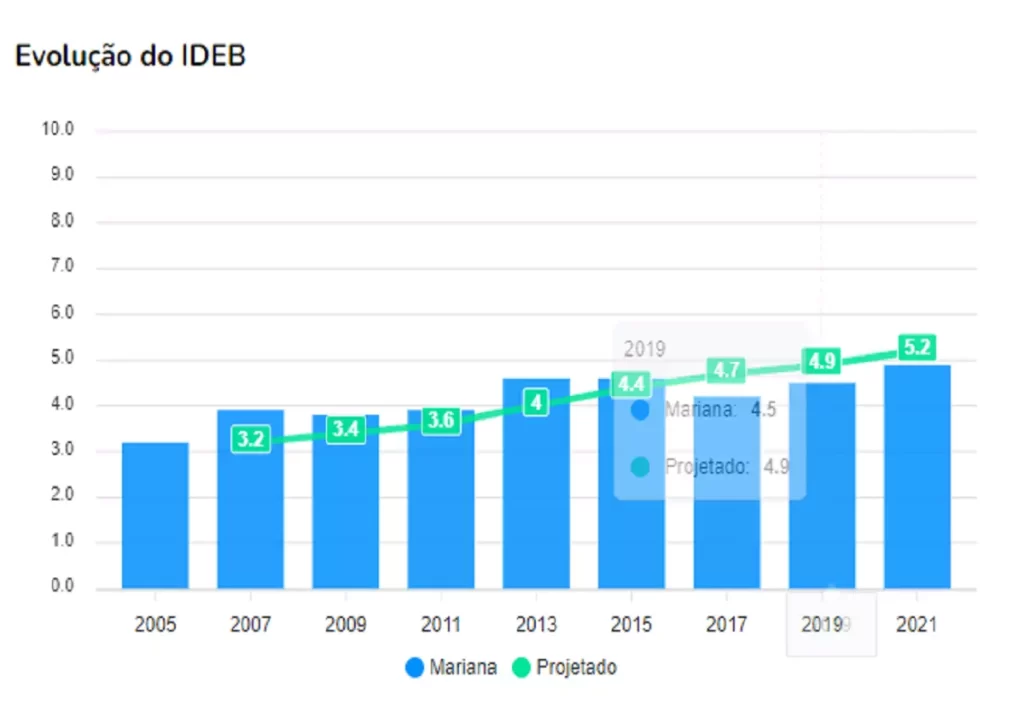 Os gráficos abaixo, demonstram um indicador que possibilita o monitoramento da educação das cidades da Região dos Inconfidentes. Por meio da taxa de rendimento escolar (aprovação) e a média de desempenho em exames aplicados pelo Inep (Instituto Nacional de Estudos e Pesquisas Educacionais). A linha verde apresenta a pontuação que o IDEB espera que a escola atinja no ano, enquanto a coluna azul mostra o resultado obtido pela instituição de ensino.