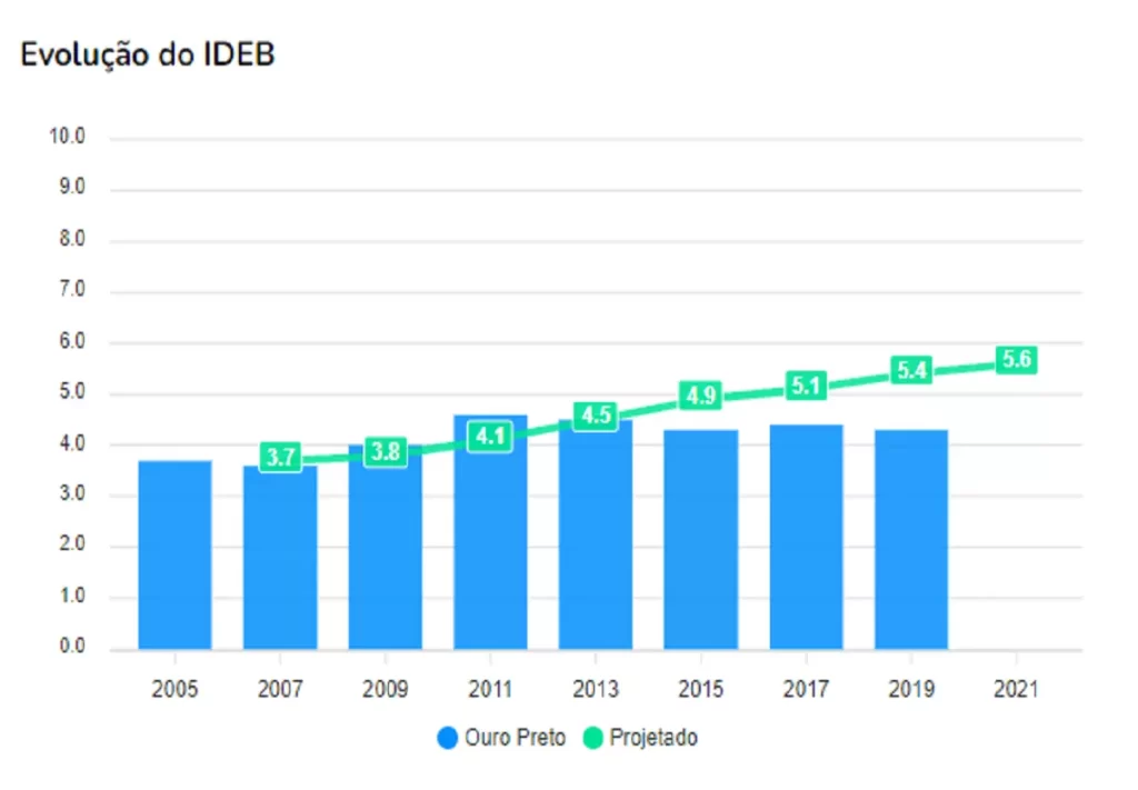 Segundo o Índice de Desenvolvimento da Educação Básica (IDEB), que mede a qualidade do aprendizado nacional, Ouro Preto está em desvantagem em relação a outros municípios, como Mariana e Itabirito, pois não consegue alcançar a projeção feita.