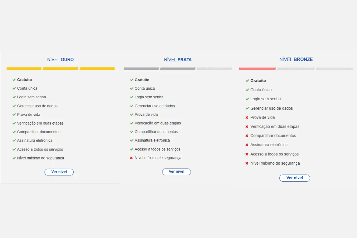 A conta do gov.br, agora, possui os níveis bronze, prata e ouro, que determinam o grau de segurança no processo de validação dos dados do usuário, os tipos de serviços públicos digitais que podem ser acessados e as transações digitais que podem ser realizadas na conta. O nível bronze, por exemplo, impede a visualização e o compartilhamento de dados e documentos digitais, o uso de serviços gratuitos de assinatura eletrônica, o acesso a serviços que exigem maior grau de confiabilidade da conta e a habilitação da autenticação em duas etapas. O nível ouro é o grau máximo de segurança.