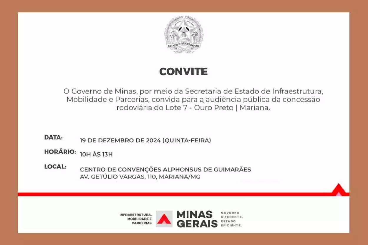 Cumprindo determinação legal, o Governo de Minas promove audiência pública, agendada para esta quinta-feira (19), a partir das 10h, no Centro de Convenções de Mariana, destinada a tornar público, colher sugestões e contribuições ao projeto de concessão patrocinada de serviços públicos para a exploração da infraestrutura, operação, manutenção, monitoração, conservação, ampliação da capacidade e manutenção do nível de serviço do sistema rodoviário do Lote 7 – Ouro Preto – Mariana do Programa de Concessões Rodoviárias do Estado de Minas Gerais. Com divulgação deficiente, a cargo do governo estadual, o evento de relevante importância para a população das cidades no entorno da rodovia, foi marcada para o mesmo horário da cerimônia de diplomação do futuro prefeito e vereadores eleitos em outubro, impedindo que os representantes do povo marianense possam participar da audiência.