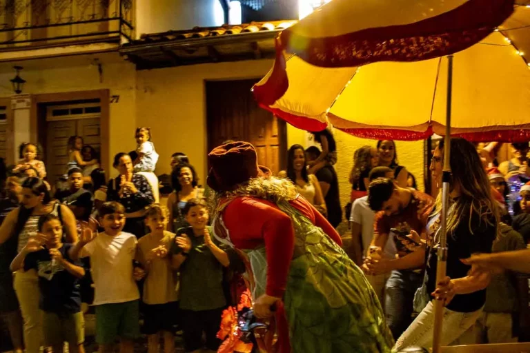 E quem acha que o cortejo acabou por aí está muito enganado! A banda seguiu agitando o clima com trompetes e batuques, bem acompanhados por uma turma animada com balões coloridos com led. O Circo Volante distribuiu risadas e surpresas, com muita pirofagia e malabarismos, acompanhando-os muitas bailarinas quase etéreas vestidas de branco.