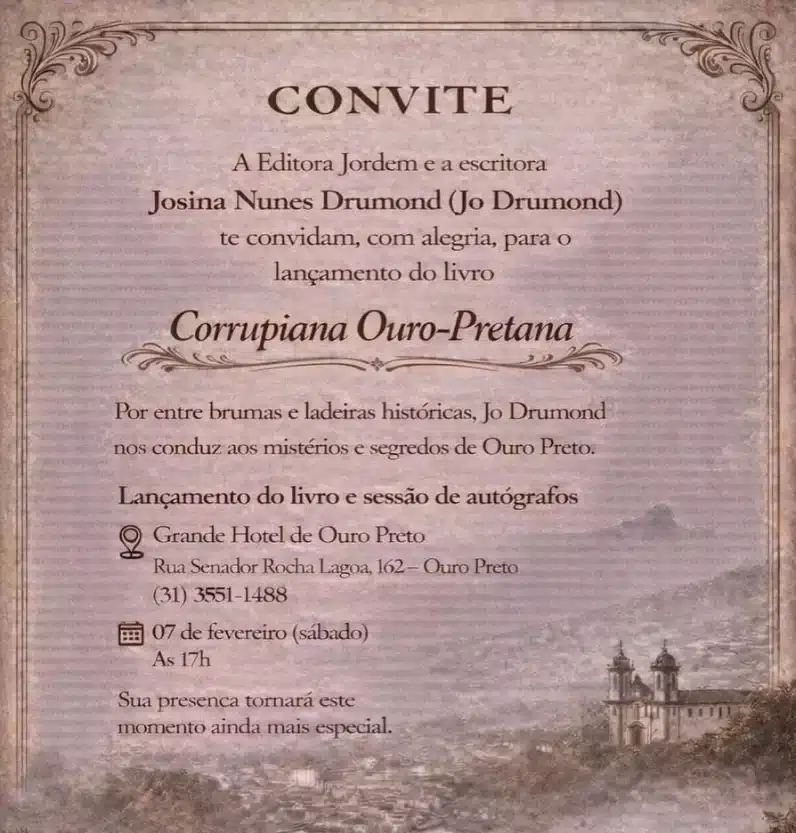 A Editora Jordem e a escritora Josina Nunes Drumond (Jo Drumond) têm a honra de convidar para o lançamento do livro Corrupiana Ouro-Pretana.