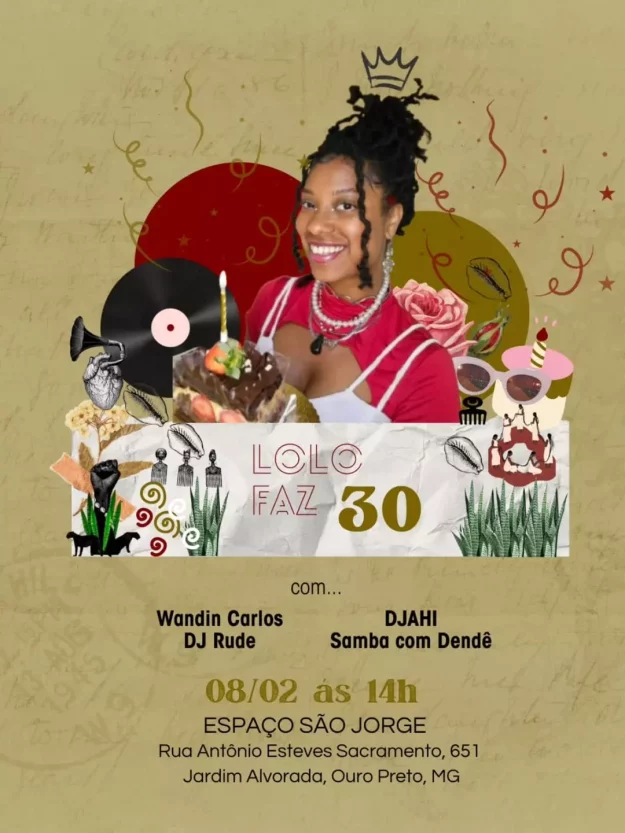 No dia 8 de fevereiro, o Espaço São Jorge em Ouro Preto vai ser o quilombo da celebração. Do MPB ao Samba com Dendê, vamos exaltar nossa estética, nossa música e nossa força em pleno pré-carnaval da cidade. Vamos celebrar a vida, a arte das tranças e os meus 30 anos com muito MPB, Ragga, Funk e Samba!