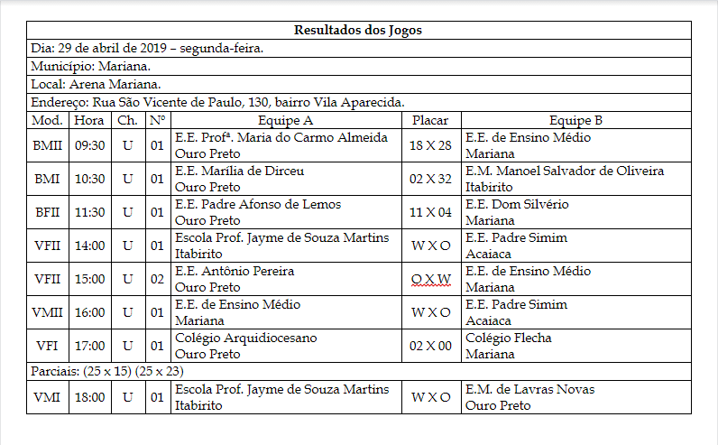 JEMG Mariana: muitas desclassificações por não comparecimento de equipes Luiz Loureiro 2 de maio de 2019